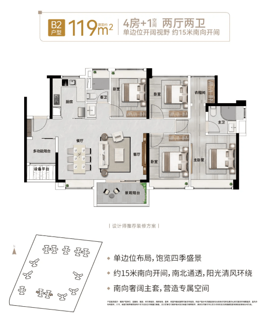 119平方米的4+1房采用典范竖厅设想,南向三开间采光,从卧带步入式衣帽间,低总价即可实现河汉换房需求。这个户型适百口庭较多,或者对栖身空间有更高要求的改善型客户。